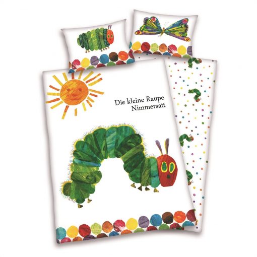 Dit prachtige Rupsje Nooitgenoeg flanel dekbedovertrek maakt van elke kinderkamer een plaatje! Rupsje Nooitgenoeg heeft altijd honger en eet dan ook lekker door, totdat hij op een dag een prachtige vlinder wordt. Op de kussensloop zie je rupsje aan de ene kant en de mooie vlinder die hij geworden is aan de andere kant. Het lachende zonnetje en de mooie kleuren maken er een vrolijke boel van. Hopelijk heb jij niet net zoveel honger als Rupsje Nooitgenoeg!